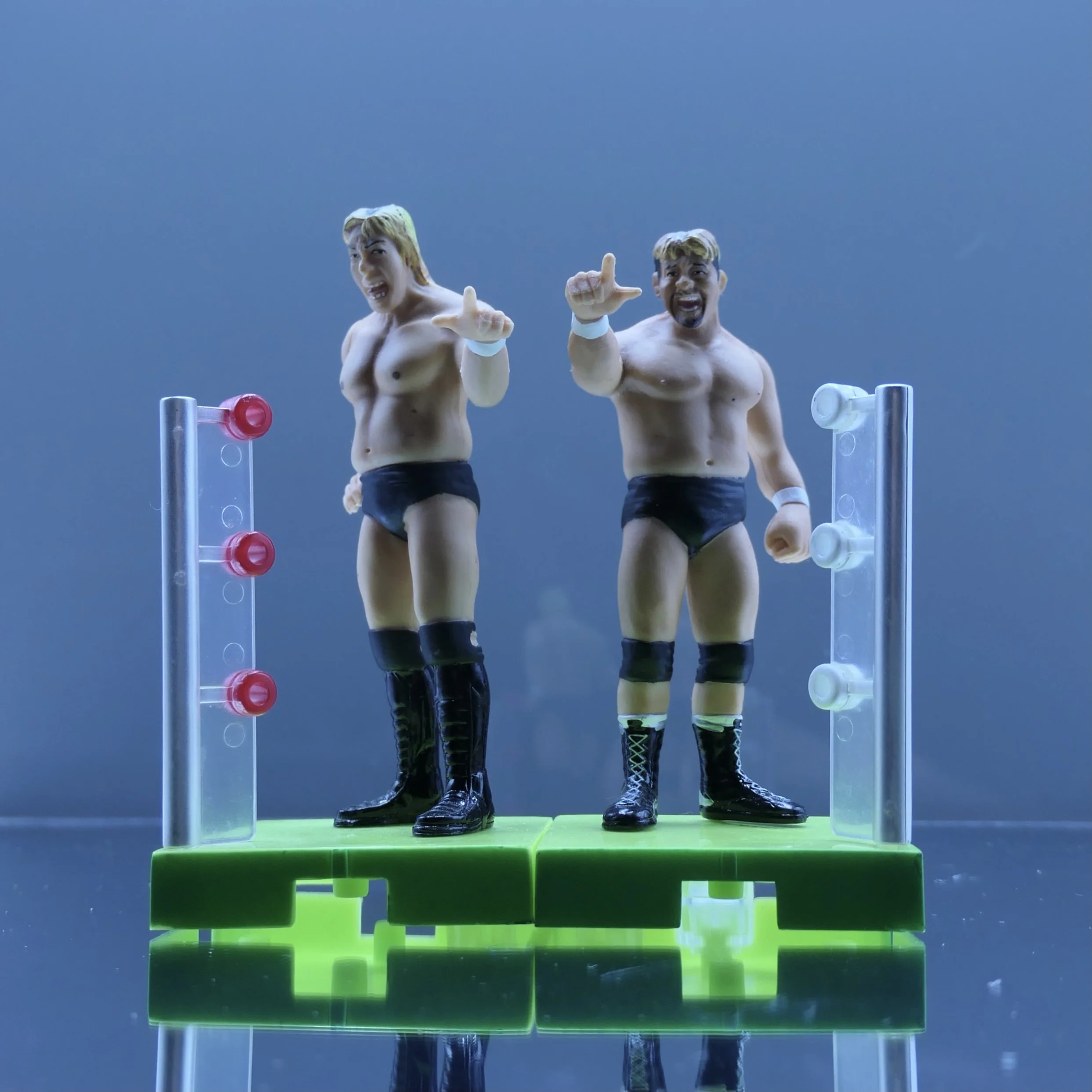 Yujin’s Sculpture choice in this line stood true to the toyetic features that the AJPW Line had with more distinct statuesque posing, distributed through the Blind Box system they also featured green figure stands that resembled NOAH’s branding as well as their founder’s Emerald Green in ring attire. These Figure stands once collected with additional pieces would form the NOAH Wrestling Ring . . . the only catch is in order to get the full ring display you would need Nine base pieces, so the assumption of duplicates, repeat buyers or a frenzy to collect all stands to form the ring adds a interesting new layer to the psychology behind collecting this particular set over others.
